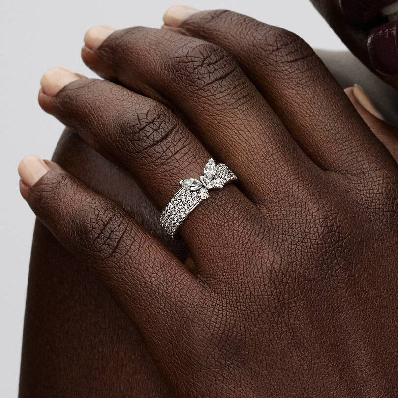 Atrévete con nuestro anillo de mariposa macizo. Con medio pavé de circonitas cúbicas transparentes, presenta un diseño de mariposa con delicadas piedras que le aportan un toque de brillo y movimiento.