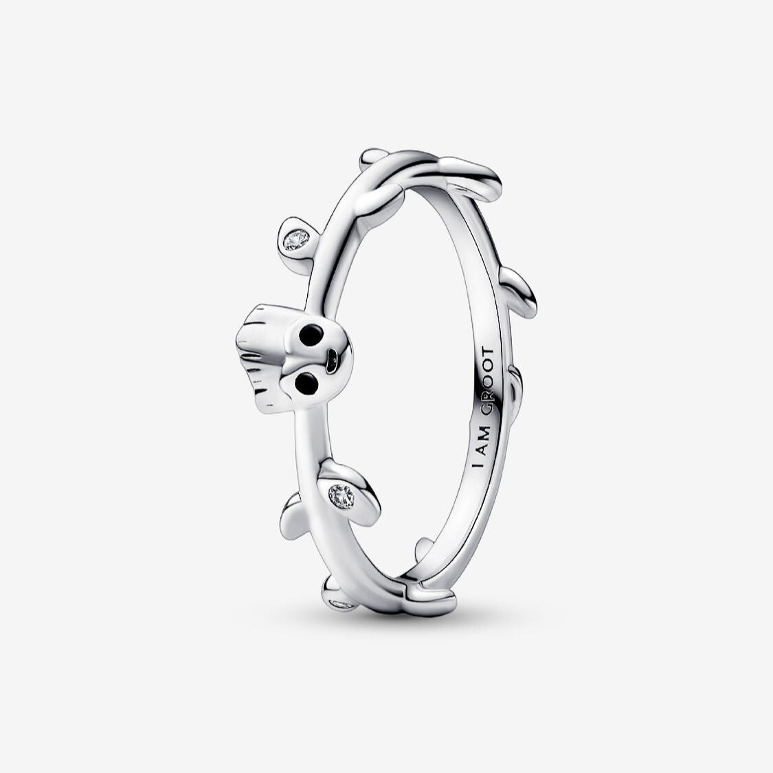 Terminado a mano en plata esterlina, presenta el rostro dulce y sonriente de Groot en el centro y hojas alrededor de la banda. Agregando profundidad y brillo, los ojos de Groot están detallados con esmalte negro aplicado a mano y cuatro de las hojas están engastadas con circonita cúbica transparente. Lo único que dice, "I AM GROOT" está grabado en el interior de la banda.