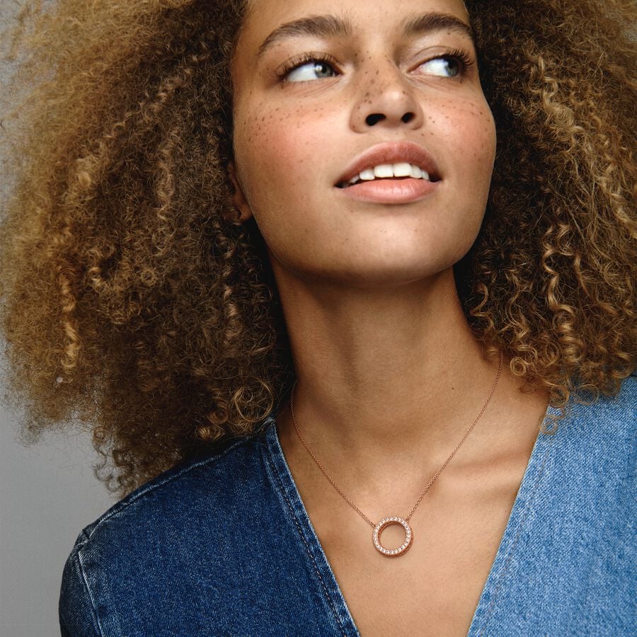 Completa tu atuendo con este collar brillante elaborado en baño de oro rosa 14k. El colgante reversible está enmarcado con piedras brillantes en un lado y grabado con el logotipo de Pandora en el reverso, lo que le permite crear dos estilos diferentes. Para mayor versatilidad, la delicada cadena se puede ajustar a tres longitudes diferentes. Combina este collar circular con los pendientes Circle of Sparkle a juego para lograr el máximo glamour.