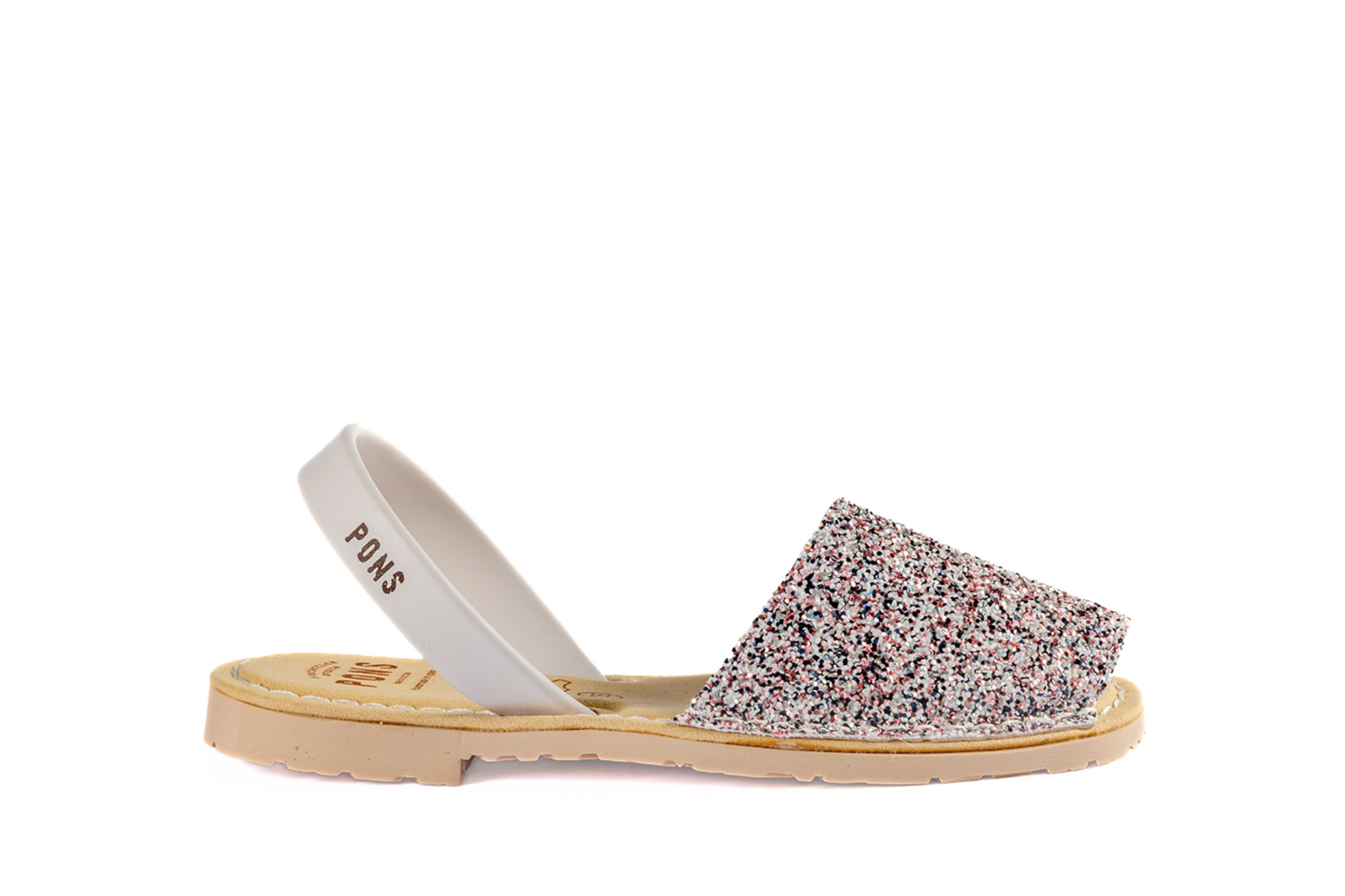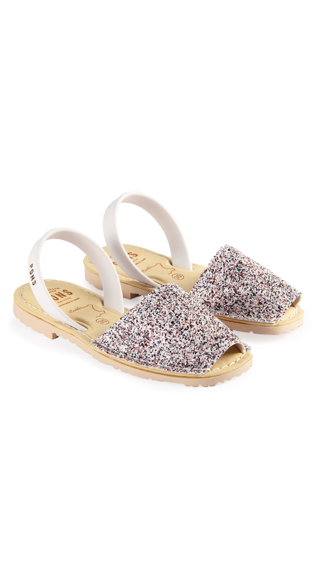 El estilo glitter es 70% poliuretano, 30% algodón y su tira trasera 100% Piel flor vacuno (Este tipo de piel es el de mayor calidad entre todos los tipos posibles, es el más resistente y duradero). Las posibles venas en la piel son garantía de su autenticidad, así como las ligeras diferencias de tono entre las diferentes producciones. Su plantilla es de gel, su suela es de caucho reciclado, fueron diseñadas para ser confortables y resistentes.