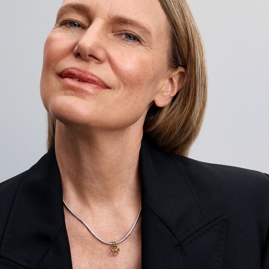 Este diseño divisible, elaborado en plata de ley y una combinación única de metales bañados en oro de 14 k, muestra los contornos icónicos de la famosa pareja, grabados respectivamente con "Better" y "Together".