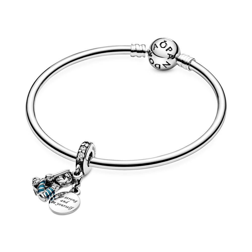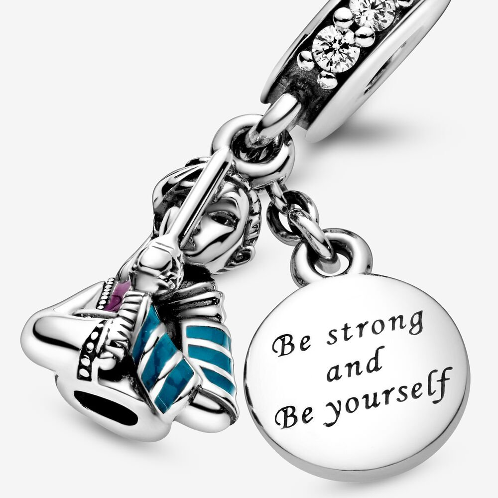 Mitad princesa, mitad guerrera, este charm de plata de ley muestra los dos lados distintivos de Disney Mulan: la forma en que la sociedad la ve y la forma en que ella se ve a sí misma. El dije de Mulan simboliza que ella es ambos y ninguno al mismo tiempo y presenta el mensaje "Sé fuerte y sé tú mismo".
