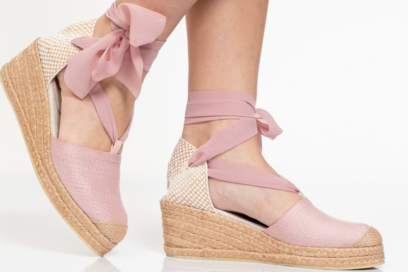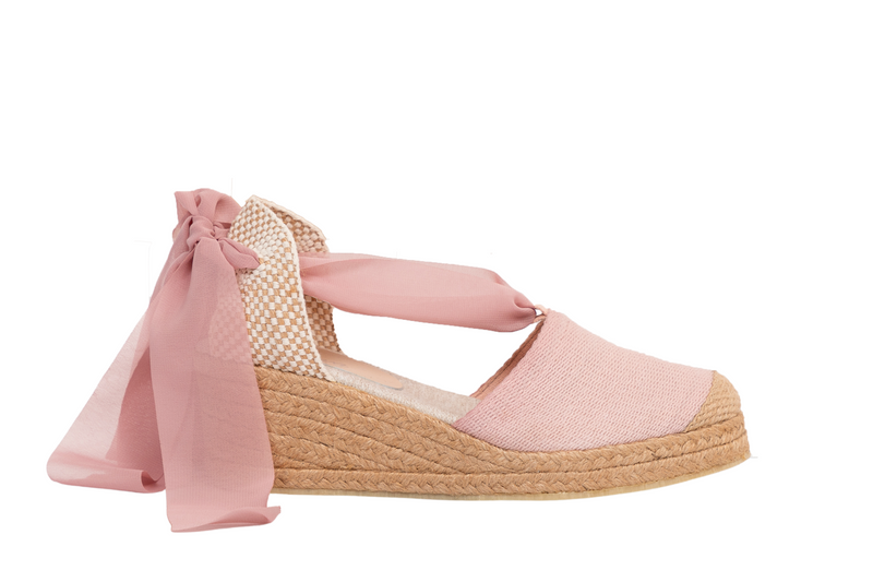 Plataforma baja color guayaba, forrada en yute, capellada textil y suela de caucho.