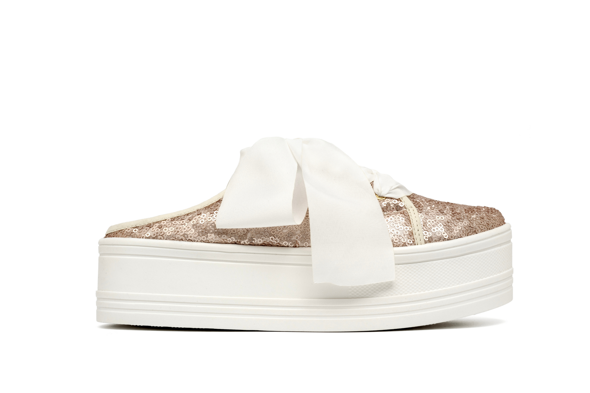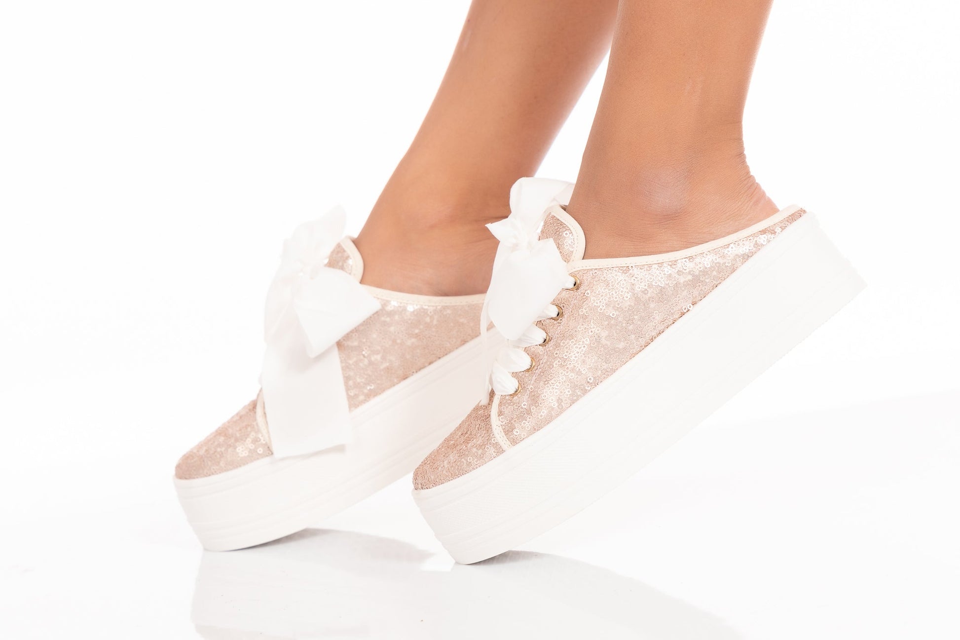 Tenis suecos lentejuelas oro rosa con velo blanco y suela de caucho.
