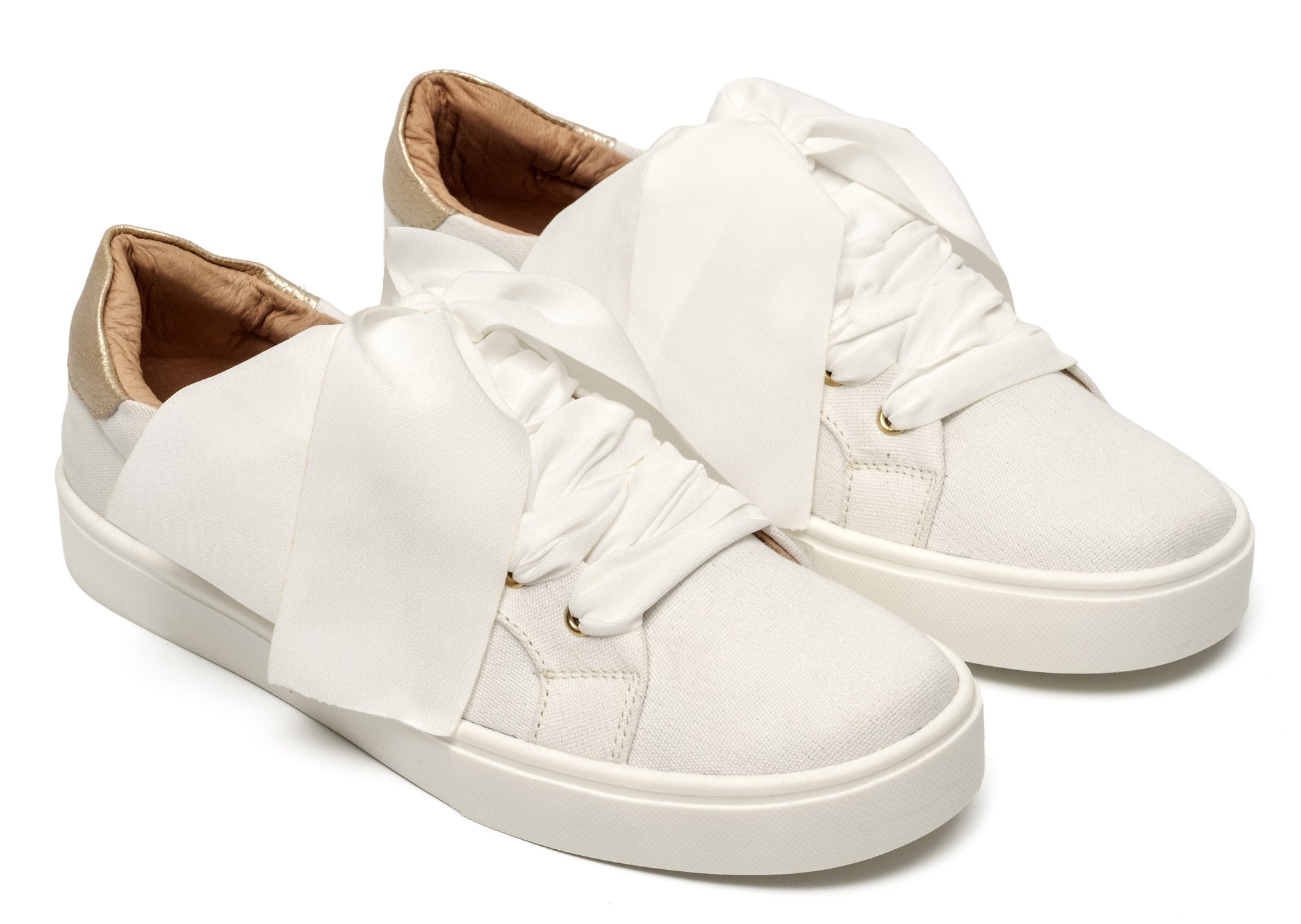 Tenis bajos textil blanco, con forro de cuero y velo blanco.