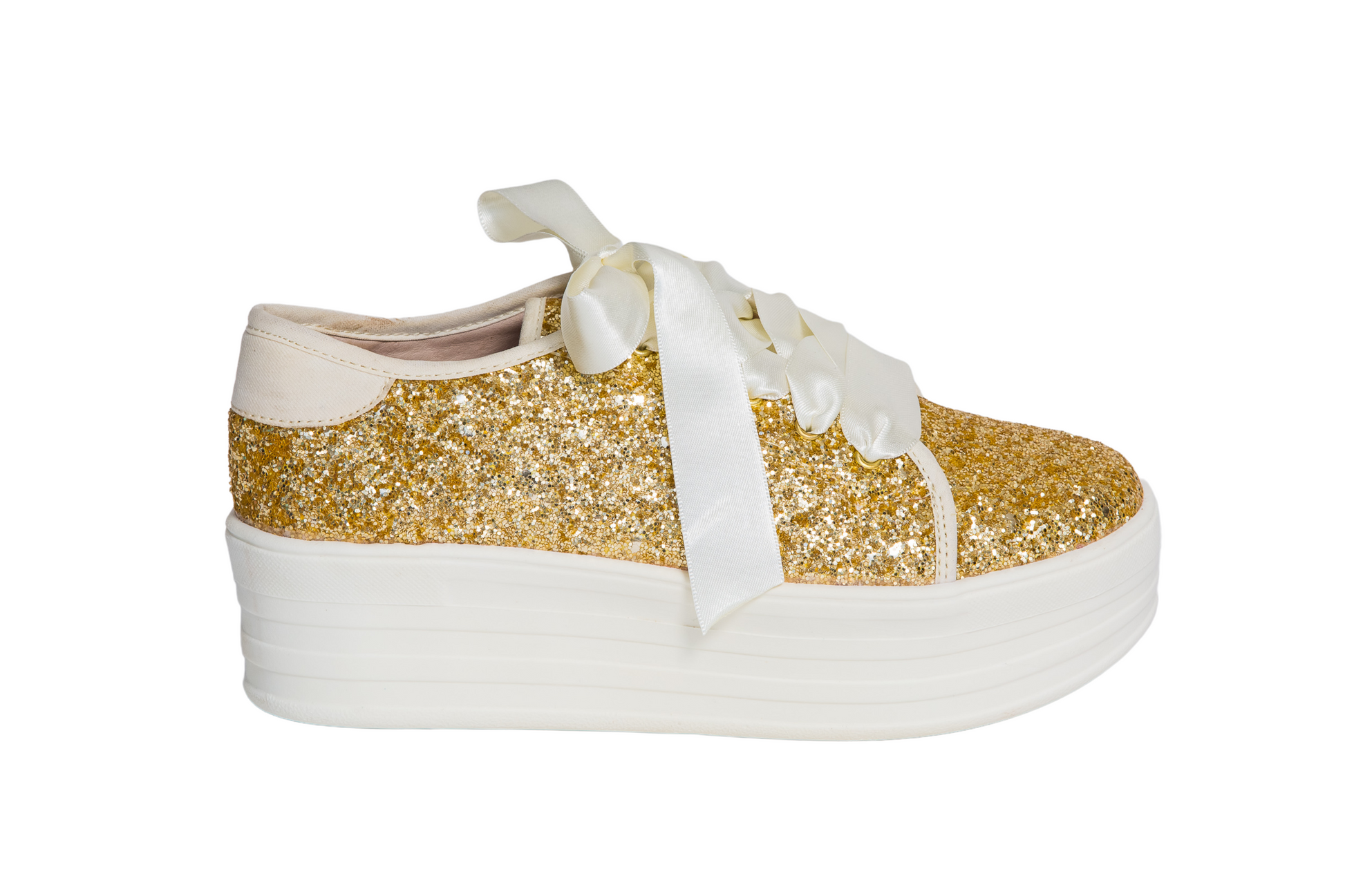 Tenis glitter color dorado con plataforma de caucho.