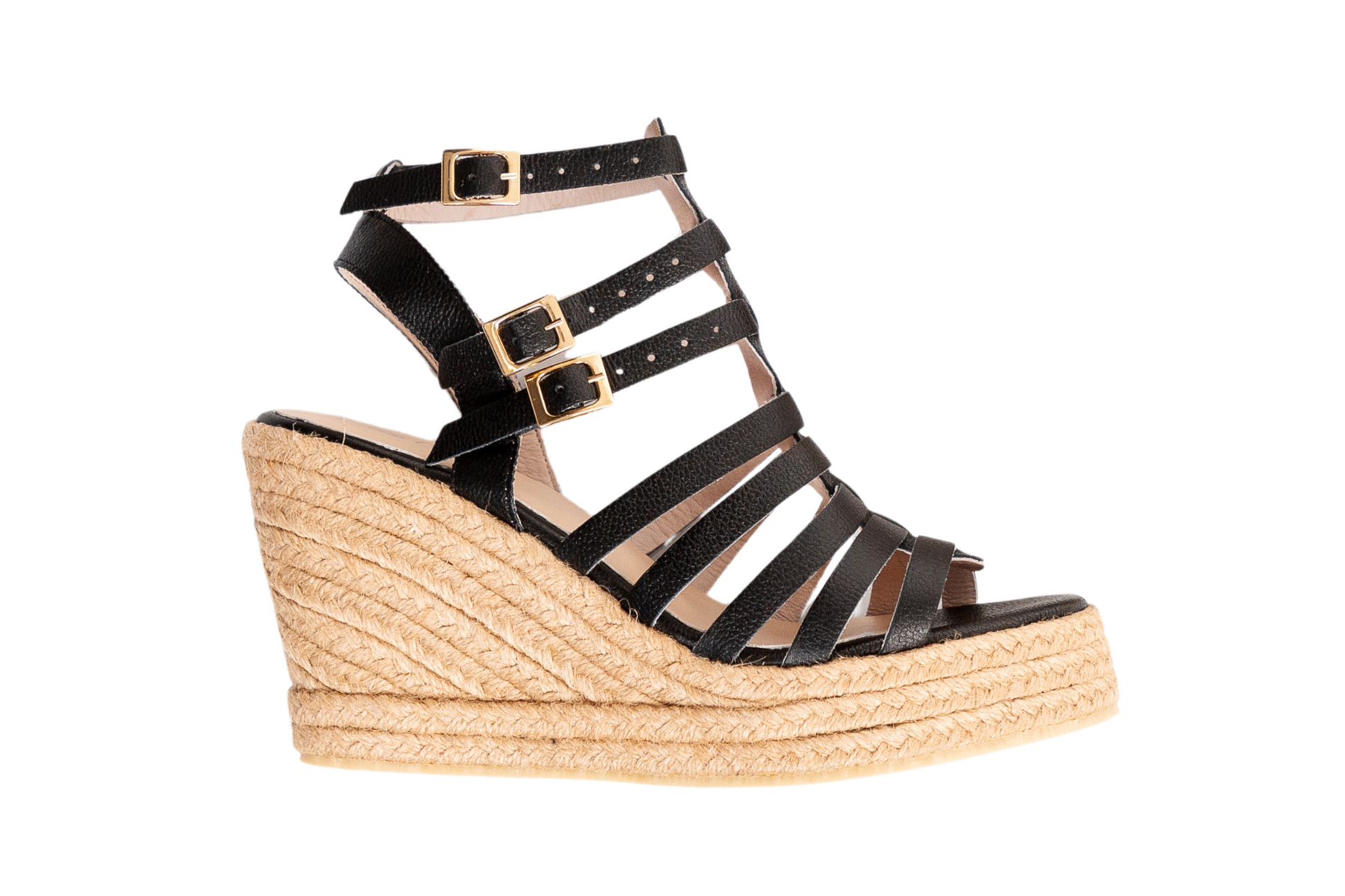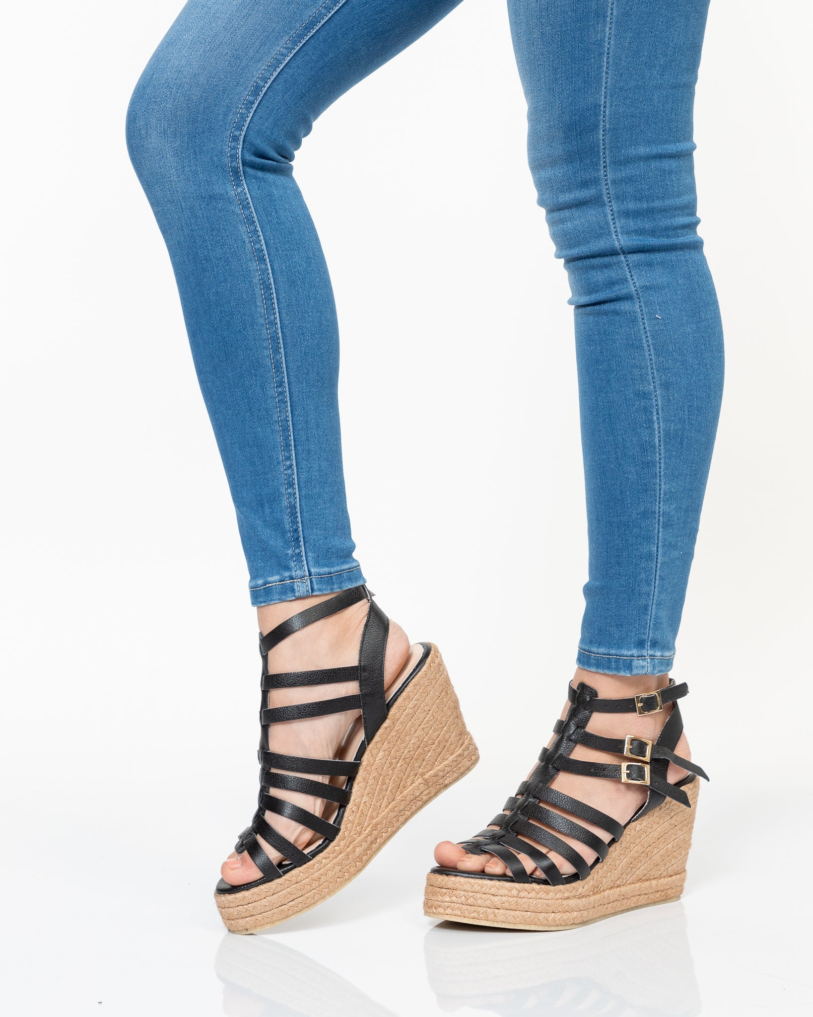 Sandalia en plataforma alta forrada en yute, capellada en cuero color negro