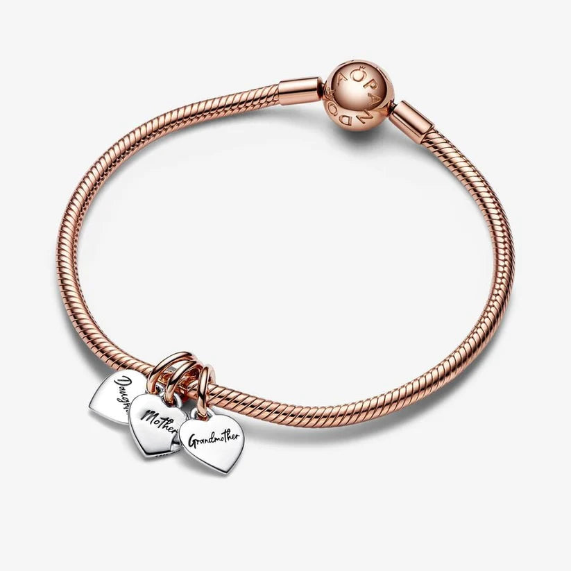 Este dije se compone de tres charms de corazón individuales, elaborados en plata de ley con 14 asas chapadas en oro rosa. Cada uno lleva grabado un miembro de la familia diferente: "Abuela", "Madre" e "Hija". Compártelos entre los tres y llévalos cada uno como un mensaje de amor entre generaciones, donde quiera que vayas.