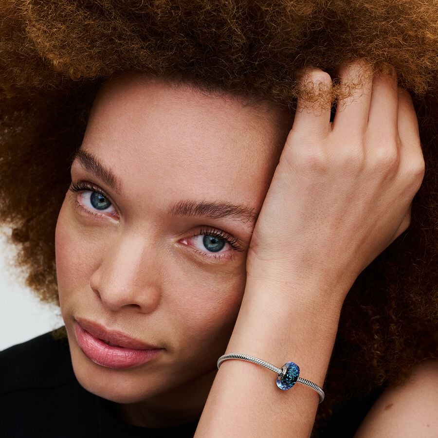 El dije inspirado en el océano está acabado a mano con cristal de Murano iridiscente y azul oscuro infundido con una pizca de brillo, envuelto alrededor de un núcleo de plata esterlina. El charm azul remató con una superficie ondulada inspirada en las olas del océano.