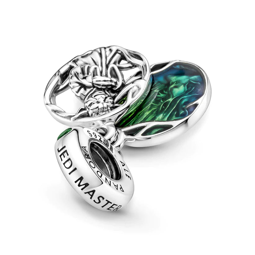 Terminado a mano en plata esterlina, este dije incluye dos colgantes, uno con un diseño calado que muestra a Yoda ™ de pie con su bastón de gimer enmarcado por una hiedra en relieve, y el otro un disco con esmalte verde y azul aplicado a mano con detalles de bosque.